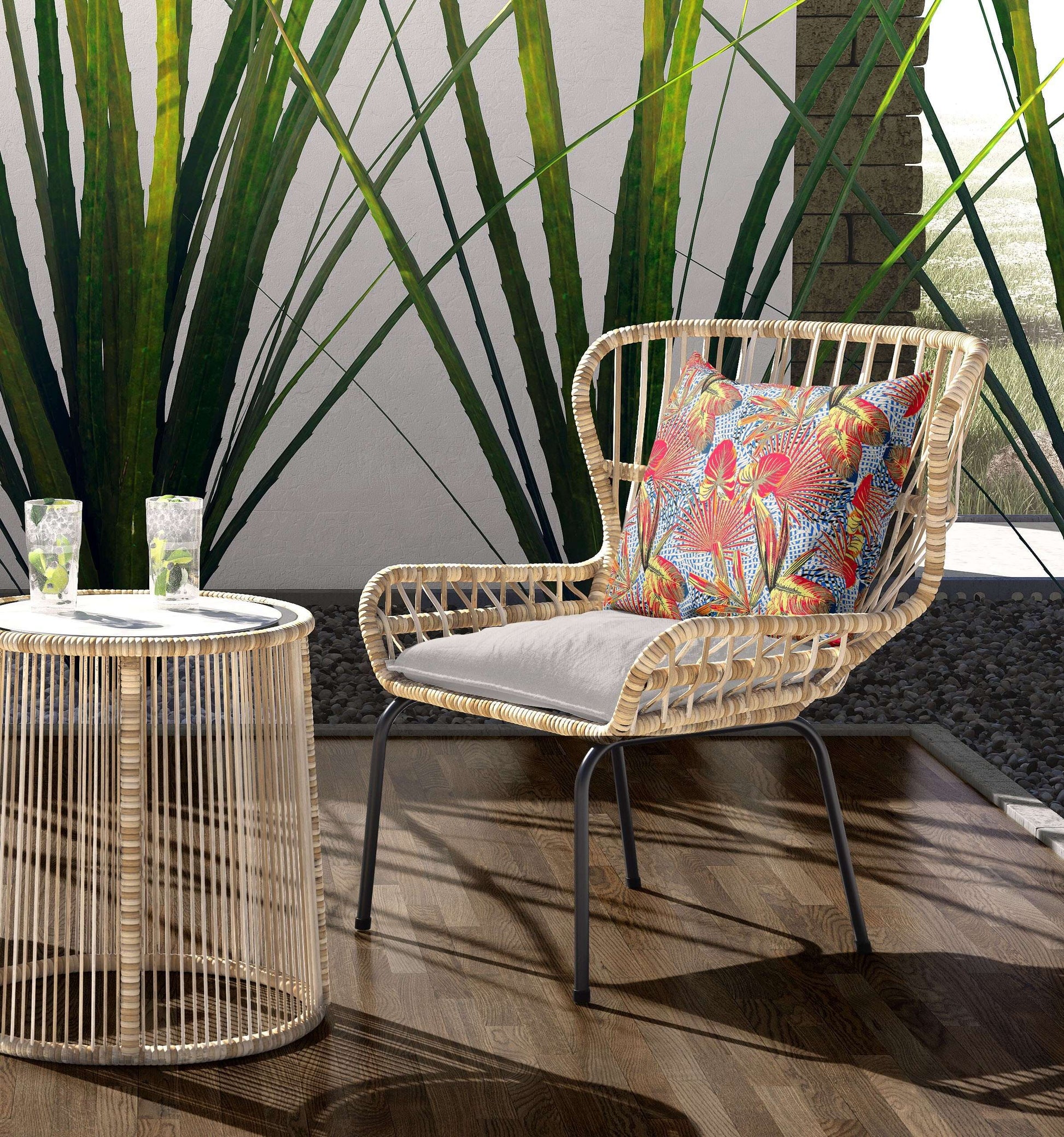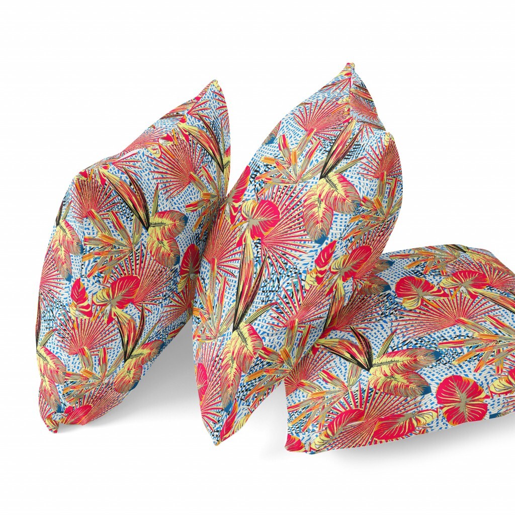 Personalize the style of your living space by adding this striking Crimson Yellow Tropical Indoor Outdoor Throw Pillow that features a harmonious combination of hues with a tropical essence. Lush foliage intertwined with a contrast of crimson, yellow and blue pigmentations represents a passion and unity of pleasant day by the beach. Crafted from sturdy broadcloth material that has a smooth texture with enhanced durability making the pillow a perfect accent for both indoor and outdoor settings. Blown and closed with a plush polyester insert, the pillow is super soft and cozy so that you can lay on it comfortably while maintaining good posture. Accentuate the subtle tones of boho poise in your beach-side home and curate a refreshing visual of natural elements with this artistic throw pillow. 16" x 16" x 5"
